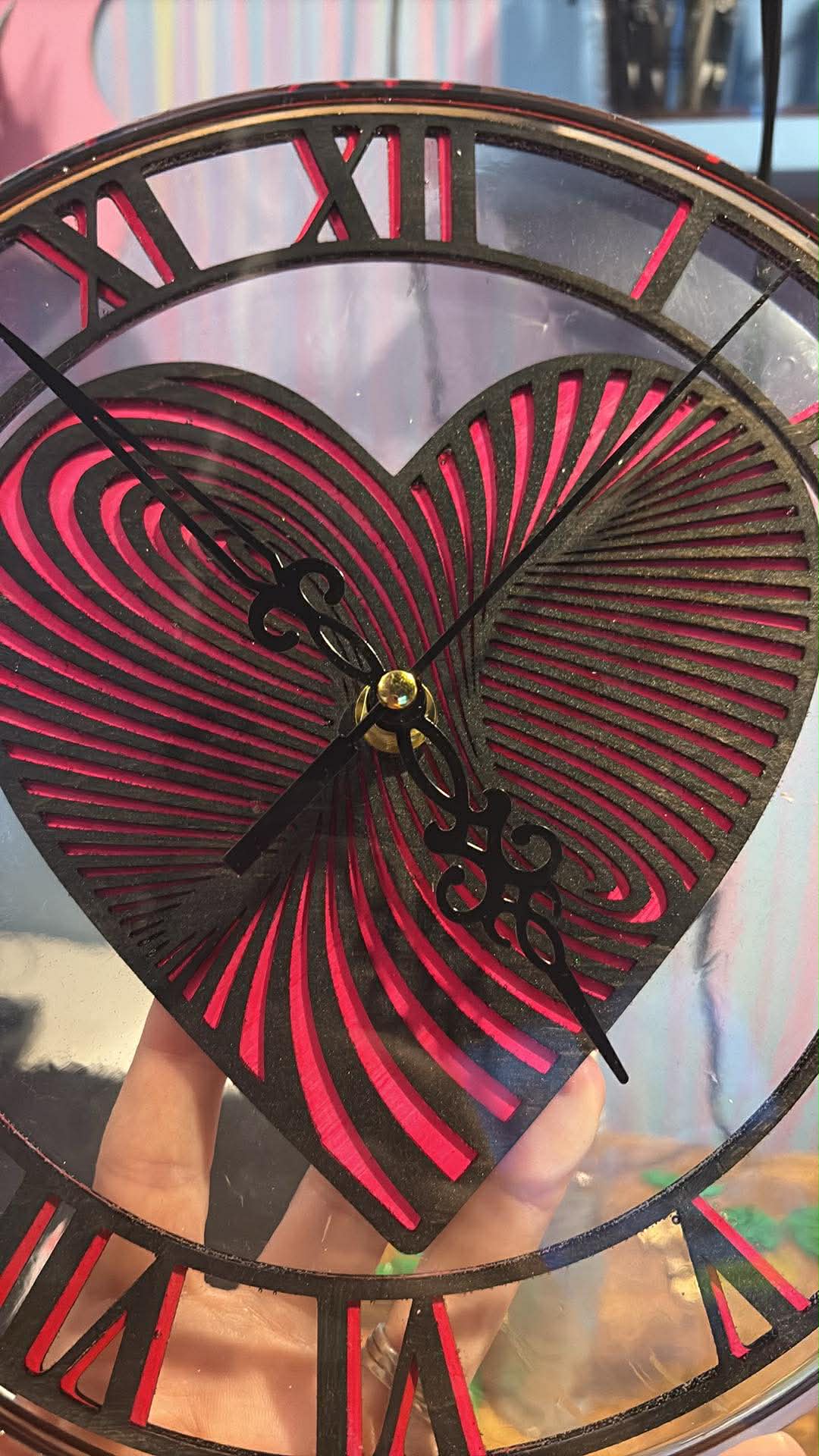 The Heart of Time Wall Clock blends modern design with emotional depth, featuring a hypnotic heart centerpiece set inside a transparent circular frame. Bold Roman numerals surround the design, while sleek black hands float effortlessly above layered details, creating a striking balance of art and function.